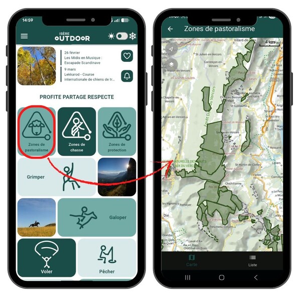 Rendez-vous sur l’application Isère Outdoor, dans « Zones de pastoralisme ». Vous y trouverez le prévisionnel des zones d’alpages en Isère sur lesquelles vous êtes susceptibles de croiser des chiens de protection.