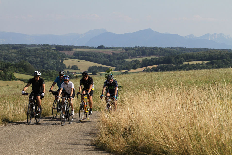 Boucle vallonnée à la découverte des paysages et du patrimoine typique des Chambaran, nombreuses constructions en pisé et galets roulés.