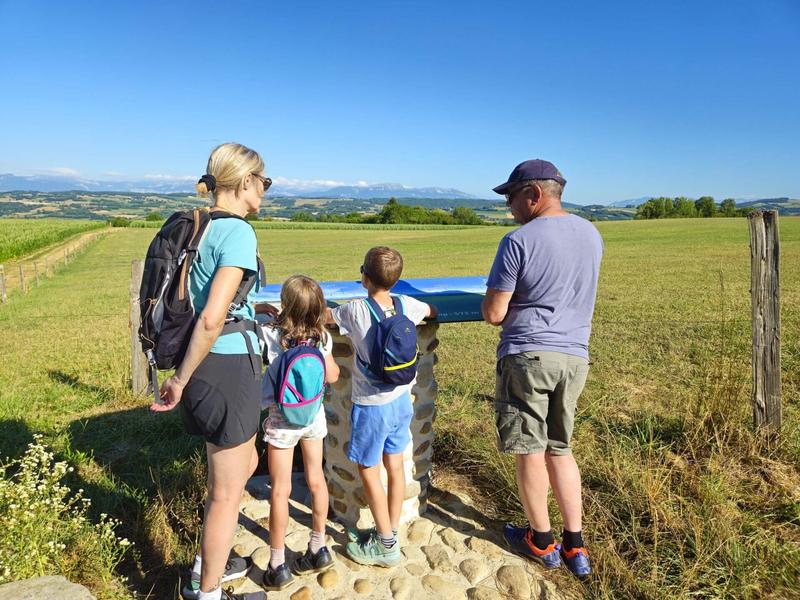 Longez la mairie sur votre gauche et montez en direction des Hauts d’Envelump et de Cote 568. Prenez alors le temps d’observer le panorama façon carte postale ! Une table d’orientation détaille le panorama. De gauche à droite, vous apercevez les sommets du Bugey, les monts du Chat, la chaîne de l’Epine et les montagnes de Chartreuse. En arrière-plan, vue sur le Mont-Blanc par temps clair.