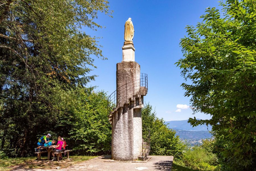 Traversez le hameau de la Sauge puis longez les prairies où pâturent les vaches. Une fois en forêt, remarquez le site du Sacré-Cœur sur votre gauche. Cette statue, érigée par les paroissiens à la fin du 19e siècle, offre une vue sur la vallée et le Bugey.