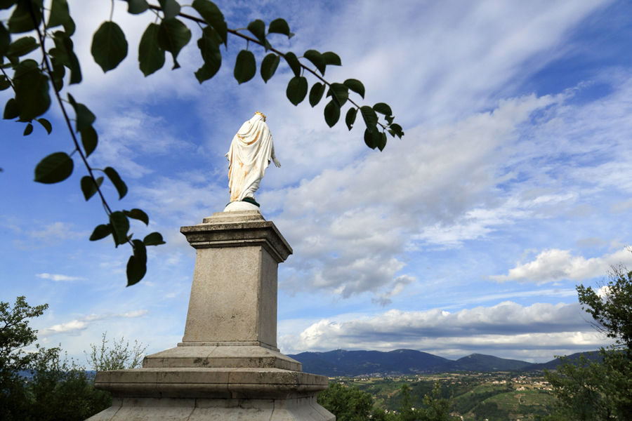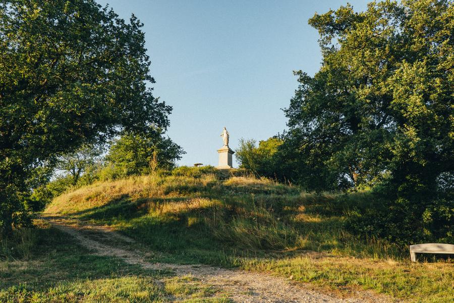 La Madone fut érigée en reconnaissance du retour dans leurs foyers des hommes mobilisés lors de la guerre franco- allemande de 1870. Juste en dessous, vous pouvez voir les derniers restes d’un château médiéval. Au XIVème siècle, pour faire cesser des conflits, le roi de France ordonne la prise de ce château, qui sera pillé et tombera en ruines.